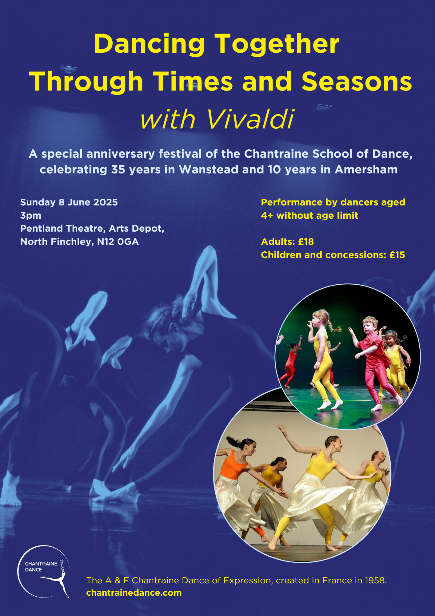 Celebrating 35 years of Chantraine Dance in E London and 10 years in Amersham, Bucks, to unite all the Chantraine dancers across the UK and to connect also with the Chantraine school in France. 130 dancers, from age 4, dance with the whole of Vivaldi’s “Four Seasons”, first performed in France in 1994. The programme