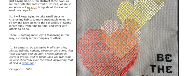 0 CommentsSee the Loving Earth Project panels. Talk informally about Quakerism. There may be a musician singing sometimes and there is hope for craftivism as well.